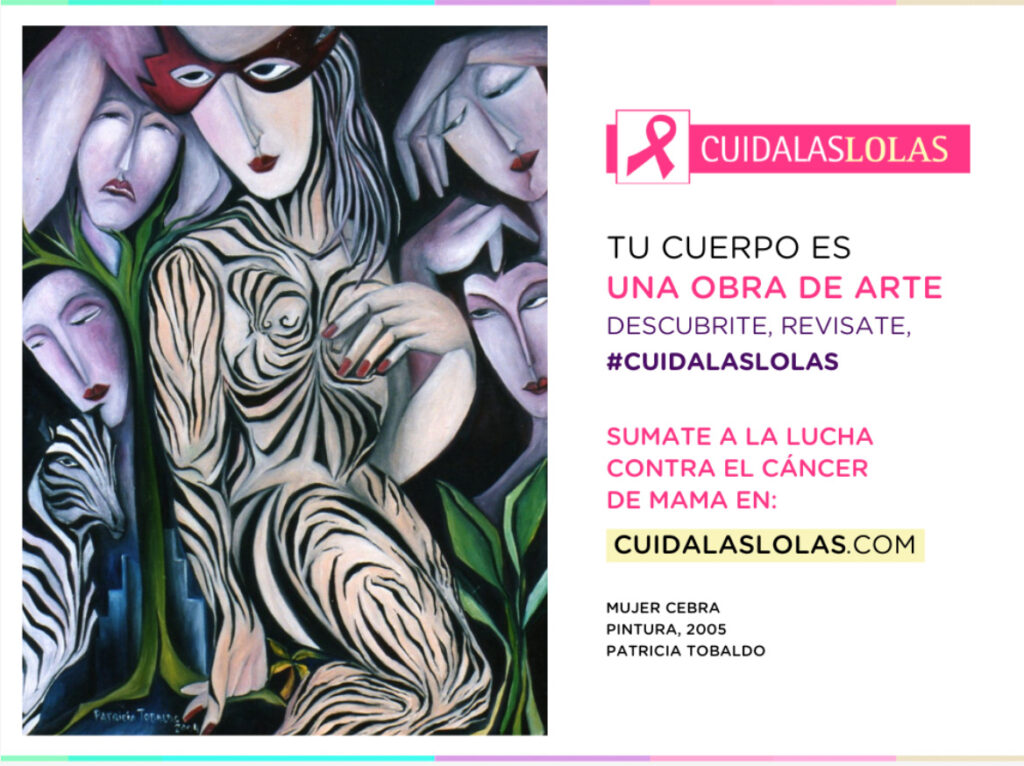 Como en años anteriores participé de la campaña “Cuidá las Lolas”, iniciativa de concientización sobre la detección temprana del cáncer de mama que utiliza obras de arte para difundir el mensaje. Este año 2023 aporté la imagen de “Mujer Cebra” – Óleo sobre lienzo (0,60 x 0,80) ya que esta obra es para mí una ocasión de reflexionar sobre la necesidad de lo artificial en la naturaleza humana, entre lo natural-artificial y entre el espíritu-materia, dialéctica de matriz romántica y metáfora absoluta.