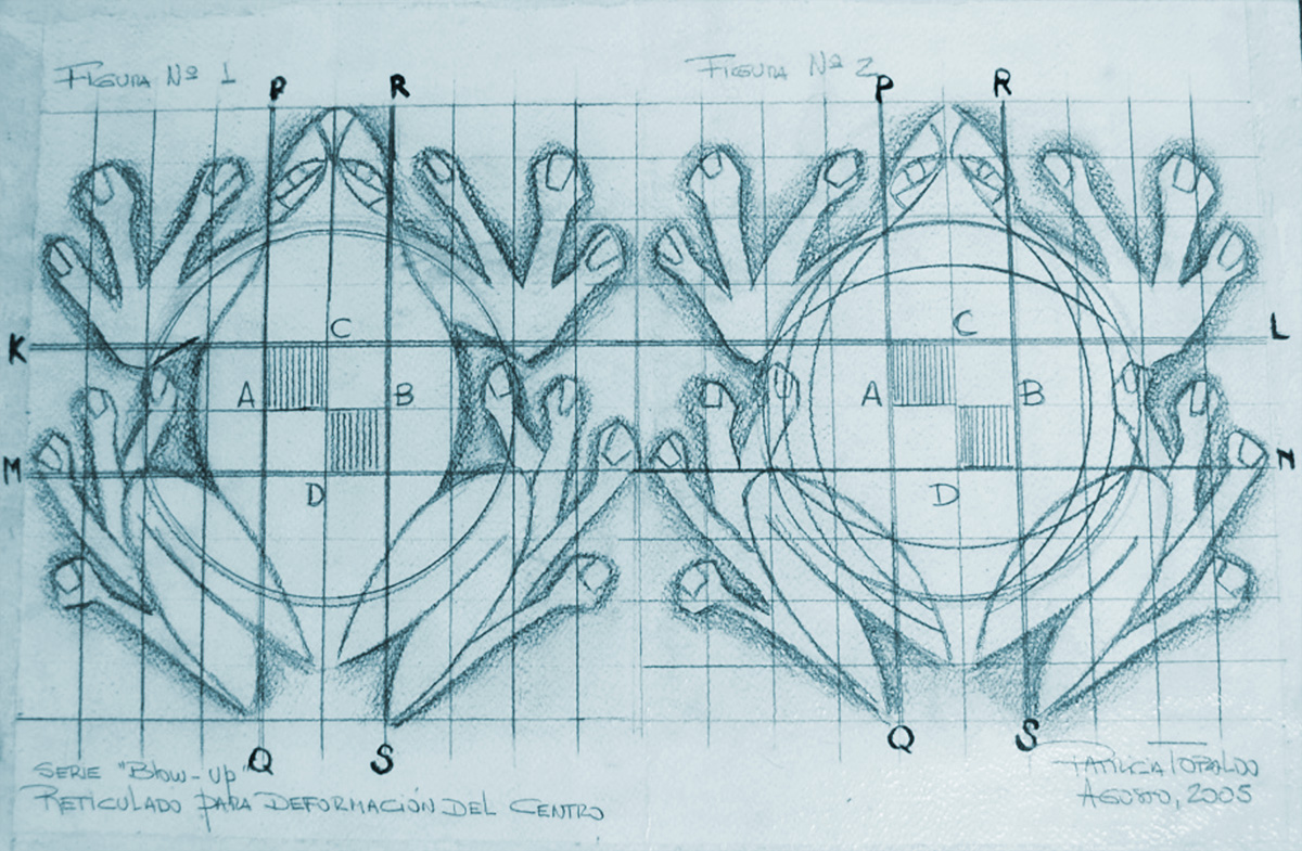 La técnica de dibujo que utilicé en esta colección se denomina “Blow–up” (inflar) inspirada en el artista neerlandés M.C. Escher y que consiste en amplificar, mediante un método matemático, varias veces el tamaño normal de la figura, como si se dibujara sobre un trozo de goma que luego se infla como un globo. Lo primero que dibujé fueron dos cuadrados divididos en cuadros más pequeños. El círculo exterior marca el límite de la amplificación. Las líneas verticales PQ y RS, y las líneas horizontales KL y MN de la figura n°1 aparecen en la figura n° 2 como líneas curvas, lo que produce el efecto de “inflado” en el centro del dibujo y en torno al punto central se ha producido una dilatación: las líneas horizontales y verticales han sido estiradas contra el límite del círculo.
