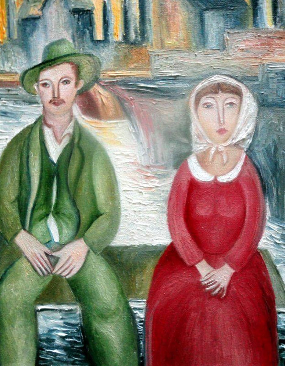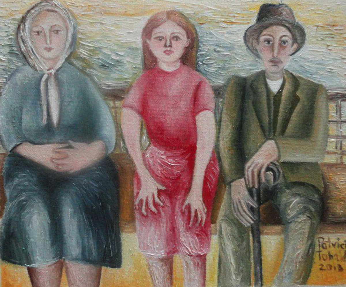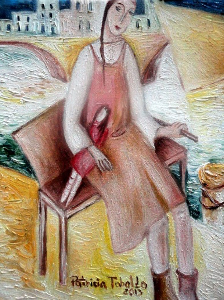 En esta pequeña colección he procurado representar los miedos y esperanzas de muchos de nuestros compatriotas. En el fondo de algunas de mis pinturas se pueden observar barcos: un futuro suspendido e inalcanzable. En primer plano, rostros ahuecados por el hambre. Algunos hombres ya han dado la espalda al pasado, otros todavía no pueden mirar más allá del mar hacia el futuro. Estoy traduciendo los sentimientos de estos rostros de hombres, mujeres y niños, en íconos tipológicos: mujer pensativa, otra que amamanta a su hijo, una niña con su muñeca de trapo, quizás el único juguete que pudo traer consigo, una anciana, mi “nonna”. En los rostros de estas mujeres están las dudas y preguntas de todos. Inseguridad, esperanza, hambre, pasado y futuro, todo se retrata en esta expectativa; la inmensidad del fenómeno migratorio desde Italia a finales del siglo XIX: familias enteras o grupos de hombres, gente humilde macerada por una vida de penuria, con melancolía en el rostro. y esperanza en el corazón, se están preparando para el gran viaje en condiciones muy difíciles, si no inhumanas.