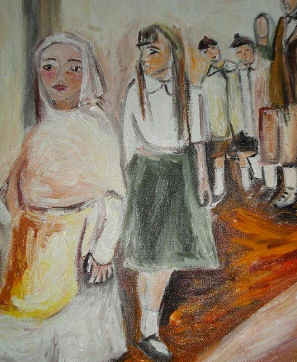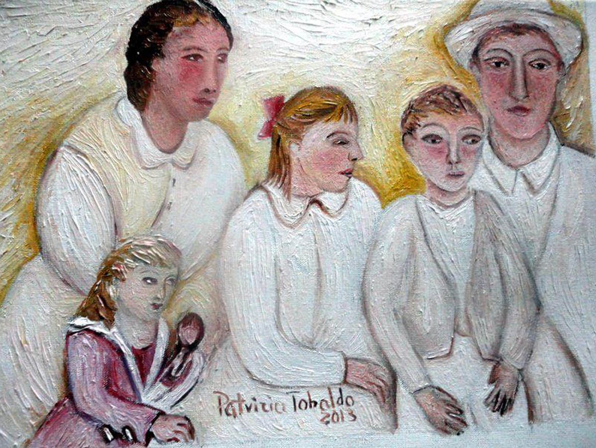 Junto a estas narraciones pictóricas, también quise retratar sentimientos como el desapego y la soledad. ¿Por qué? Porque la partida se vive como desapego, soledad, dolor, un asunto personal y familiar. La familia está en el centro de la imagen.