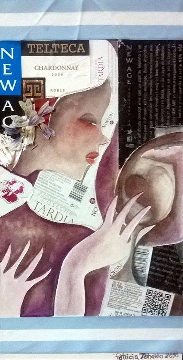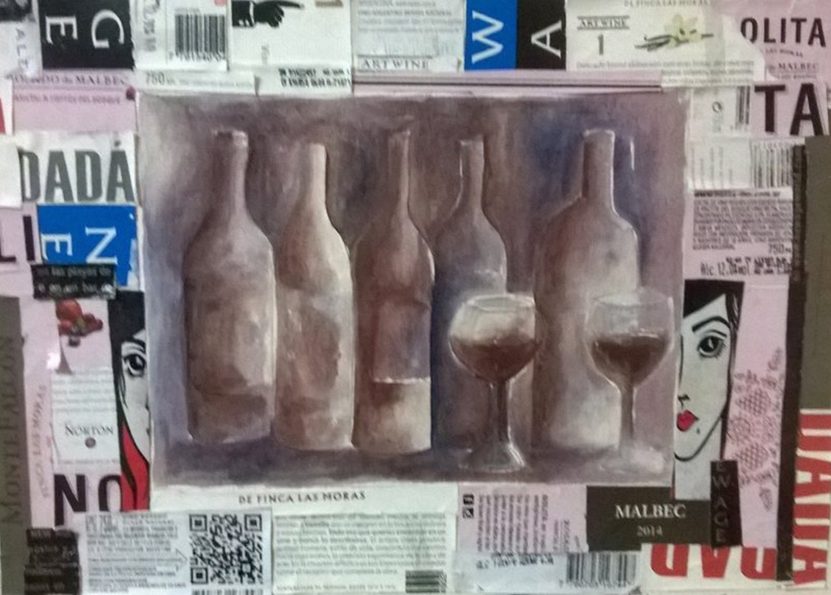 Combiné estas tonalidades cálidas, frías y neutras con la técnica del collage, utilizando etiquetas comerciales. Mis obras representan toda la temática referida al vino: vendimiadores, uvas, copas con vino…